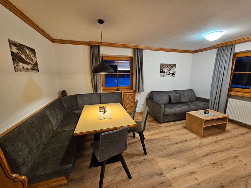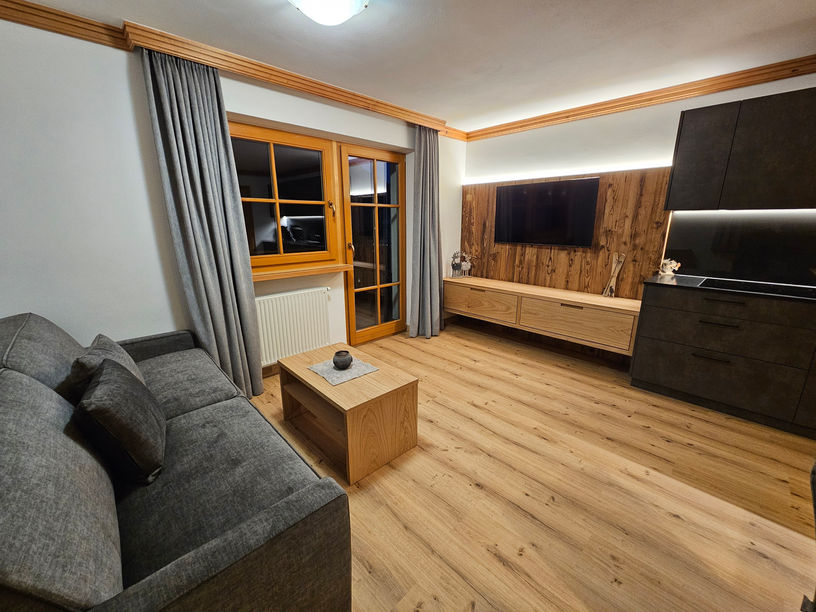 Das Appartement Ski Alm verfügt über einen gemütlichen Wohnraum mit Küche, Schlafzimmer und Badezimmer, sowie über einen Balkon nach Westen ausgerichtet mit Blick auf den Ortler und die Königspitze.